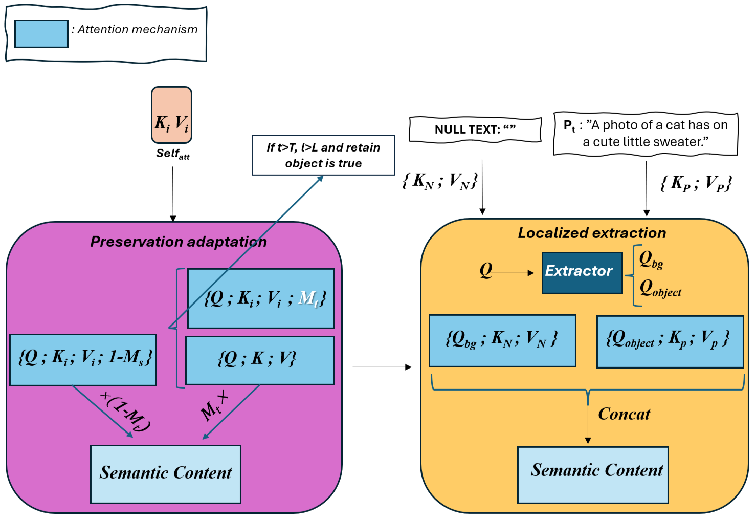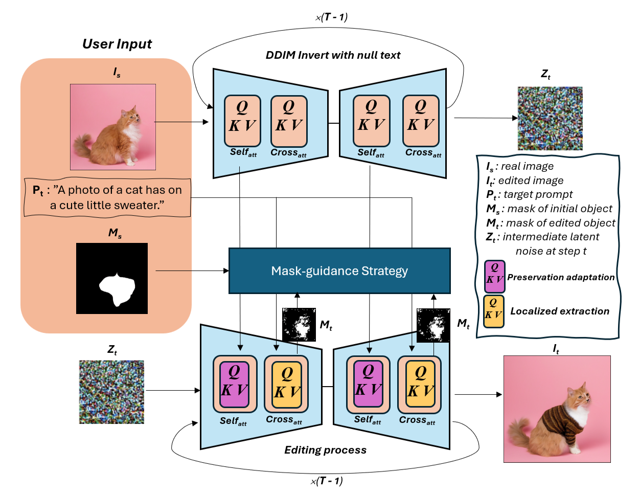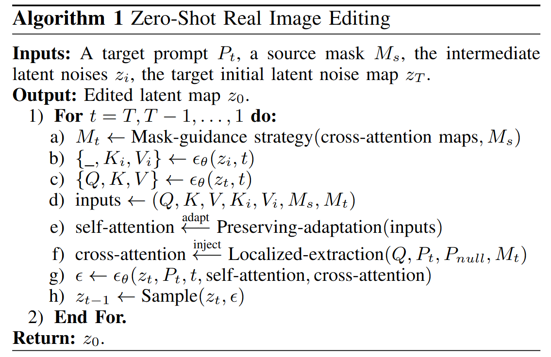 We propose Context-Preserving Adaptive Manipulation (CPAM) to edit an image Is using a source object mask Ms through the MaskInputModule, which can derive the mask in various ways, such as manual drawing, click-based extraction, or text prompts using SAM and a target text prompt Pt to generate a new image It that aligns with Pt. Notably, It may spatially differ from Is, modifying objects or background while keeping other regions unchanged. To achieve this, we introduce a preservation adaptation module that adjusts self-attention to align the semantic content from intermediate latent noise to the current edited noise, ensuring the retention of the original object and background during the editing process. To prevent unwanted changes from the target prompt in non-desired modified regions, we propose a localized extraction module that enables targeted editing while preserving the remaining details. Additionally, we propose mask-guidance strategies for diverse image manipulation tasks. Below are the overall CPAM architecture , and the zero-shot editing algorithm.