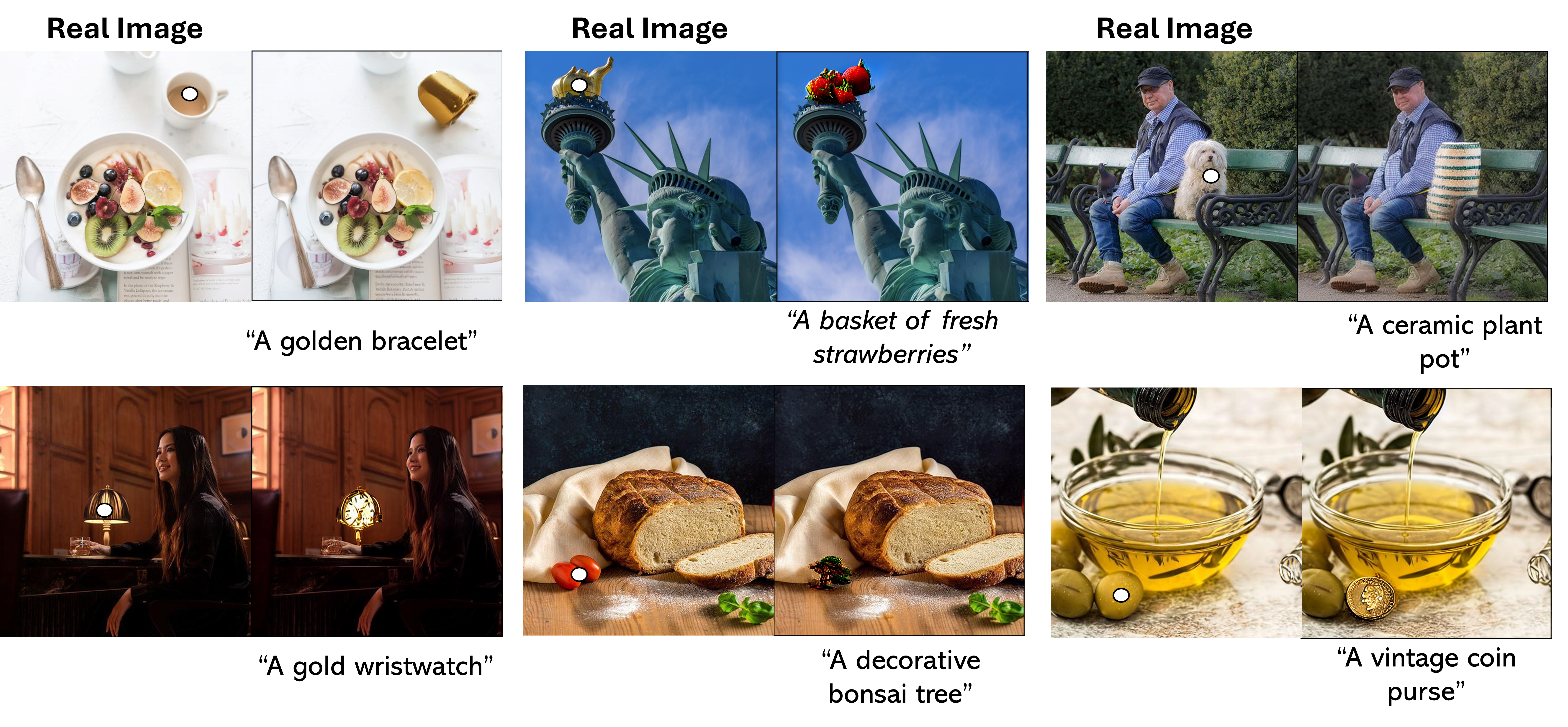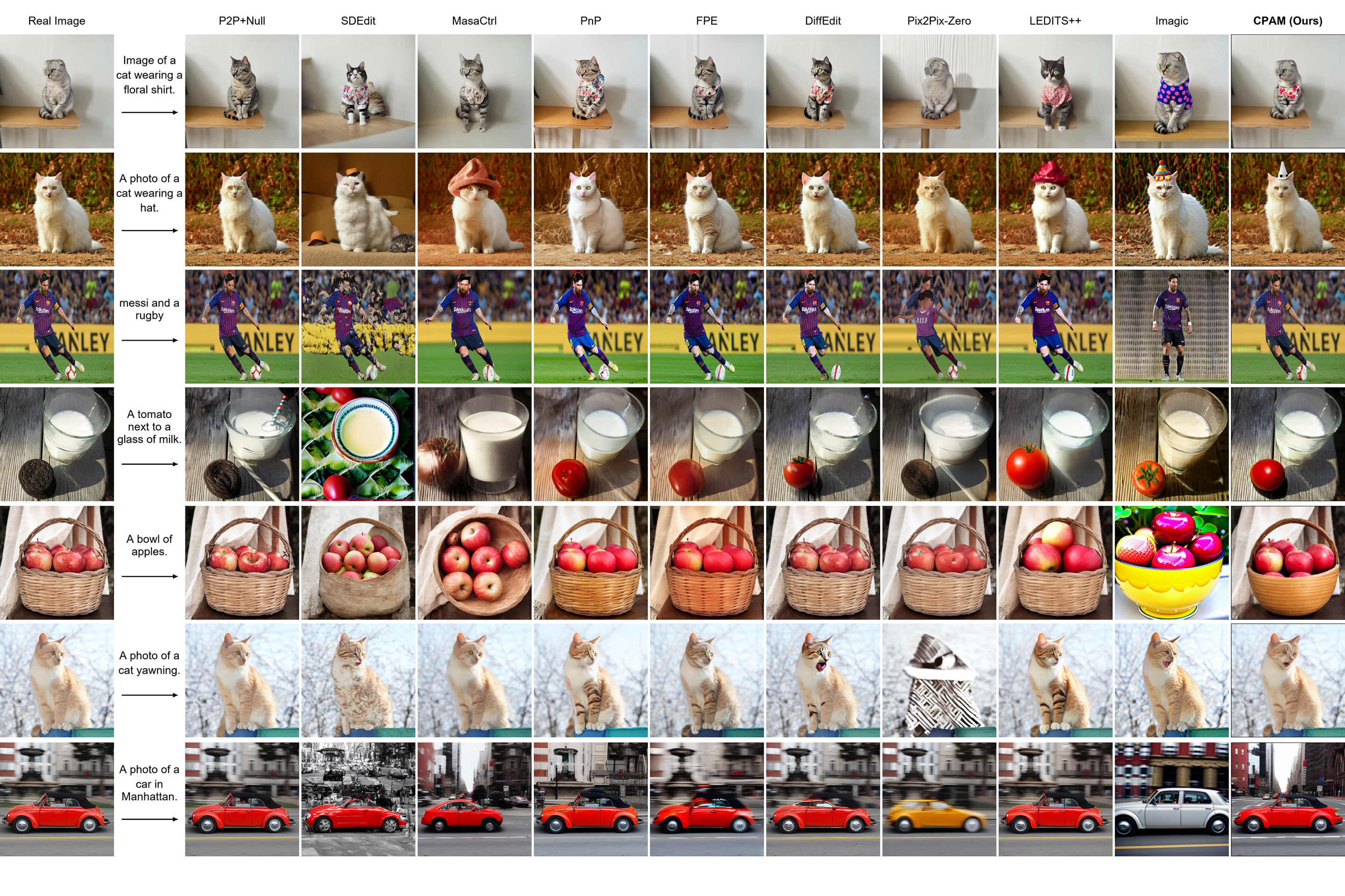 Figure shows a qualitative comparison of CPAM against leading state-of-the-art image editing techniques. Our results demonstrate that CPAM consistently outperforms existing methods across various real image editing tasks, including object replacement, view/pose changes, object removal, background alteration, and addition of new objects. CPAM excels in its ability to modify diverse aspects of images while effectively preserving the original background and avoiding unintended modifications to non-target regions.